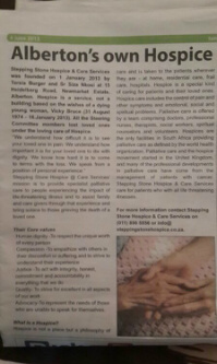 Stepping Stone Hospice is daunting. This week an article appeared in the Tames Times. It opened a floodgate of telephone calls… An elderly man called. His voice was raw with grief and despair. His wife is dying from liver cancer and he is going through all those familiar caregiver anguish. How will he know when it is time? But she is still working and in total denial…He did not want help and will put my number on speed dial… I experienced what Arlene must have experienced when I phoned her the first time…. Quite a few new patients this week…so much pain and fear…